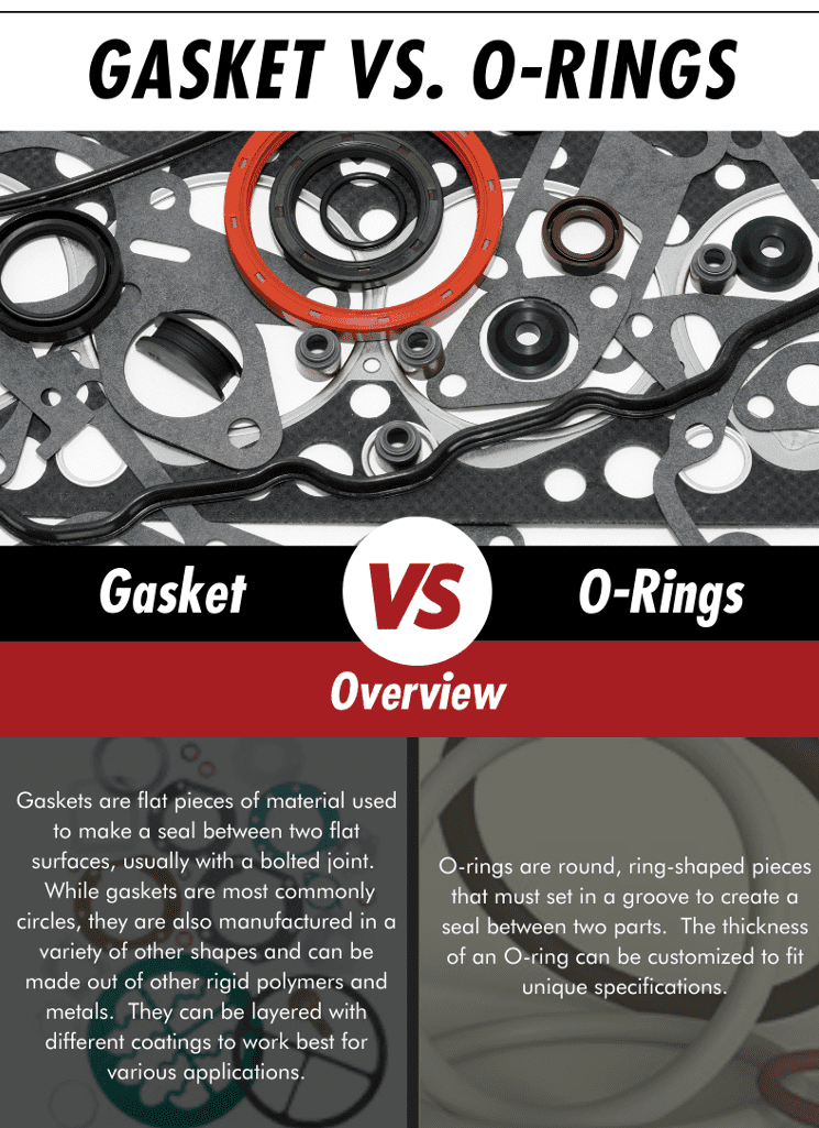 Gaskets are flat pieces of material used to make a seal between two flat surfaces, usually with a bolted joint. O-rings are round, ring-shaped pieces that must set in a groove to create a seal between two parts. While gaskets are most commonly circles, they are also manufactured in a variety of other shapes. Both gaskets and O-rings are made using flexible materials, but gaskets can also be made out of other rigid polymers and metals. The thickness of an O-ring can be customized to fit unique specifications, while gaskets may be layered with different coatings to work best for various applications.